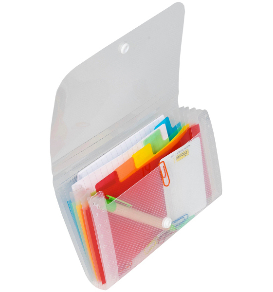 Vnitřek rozdělen barevnými záložkami na samostatné sekce. Široké otevření pro snadné zakládání.