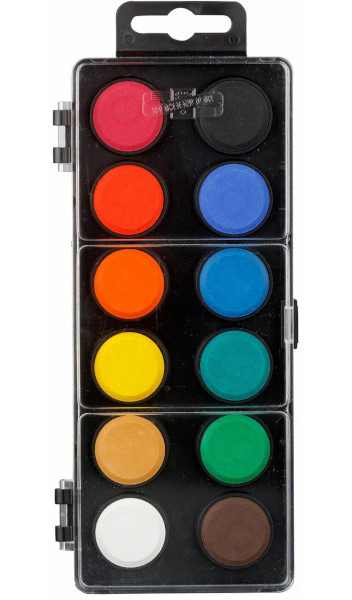 Školní vodové barvy 12ti odstínů s tabletami o průměru 22,5 mm v obdélníkových, plastových, jednopatrových barevnících s transparentním víčkem.
