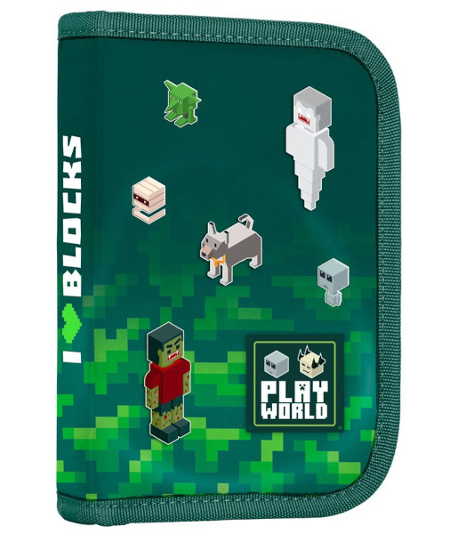 Penál: Jednopatrový se dvěma chlopněmi, poutka na psací potřeby a průhledná fólie na rozvrh hodin.