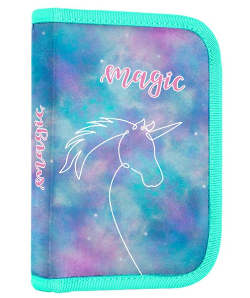 Penál: Jednopatrový se dvěma chlopněmi, poutka na psací potřeby a průhledná fólie na rozvrh hodin.