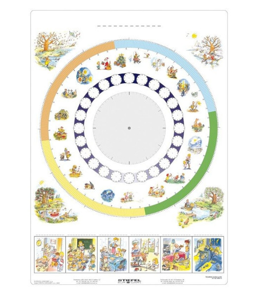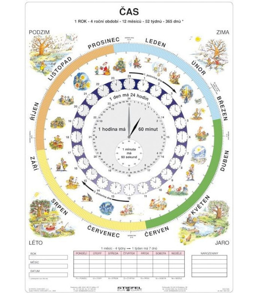 Obsah naučné tabule Čas je zaměřen na osvojení učiva především lehkou, hravou formou, podporující tvořivé poznávání hodin, částí dne, dnů v týdnu, měsíců, ročních období atd. Popisuje jejich sled a charakteristiku. Podstatnou část didaktické pomůcky tvoří kruh, který je zároveň hodinami a podkladem pro měsíce a roční období. Naučná tabule doplňuje a ilustruje výklad učitele, podněcuje žáky k aktivní práci, a tím napomáhá k základní orientaci v čase. Zadní strana slouží k procvičování a rozvoj dětské aktivity a fantazie.