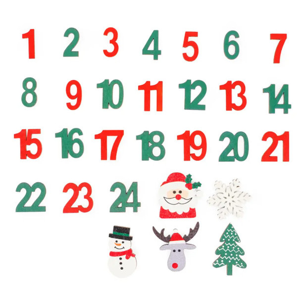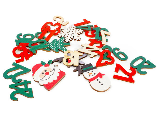 Jedná se o sadu dřevěných dekorací určenou k vytvoření vlastního adventního kalendáře.
