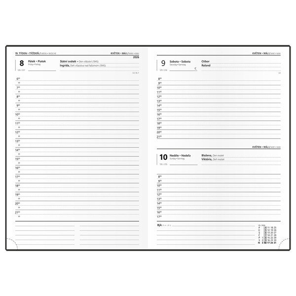 oživte svůj den barvami • denní diář v petrolejové barvě z jemné vivelly ve formátu A5 • má velký prostor pro poznámky a plánování • kalendárium: časové rozmezí 6:00 - 21:30, měsíční fáze, roční období, letní a zimní čas, znamení zvěrokruhu, odpočet dnů, měsíční tabulkový přehled, dny a měsíce v jazycích - CS, SK, EN, DE, mezinárodní svátky: CZ, SK, A, D, PL, H, GB, E, F, I, UA, místo na poznámky • informační stránky: osobní údaje, přehledný kalendář aktuálního roku a následujícího roku, měsíční plánování aktuálního roku, plán dovolených aktuálního roku, přehled státních svátků a významných dnů CZ/SK, jmenný seznam CZ/SK, daňový kalendář CZ/SK aktuálního roku, mezinárodní svátky, důležitá telefonní čísla, roční plánovací kalendář CZ/SK aktuálního roku, místo pro poznámky, mapa CZ/SK, zadní předsádka - kapsa • rozměr: 143x205 mm • vhodná technika potisku: ražba, ražba přes pásku, sítotisk • BDD6-25-26