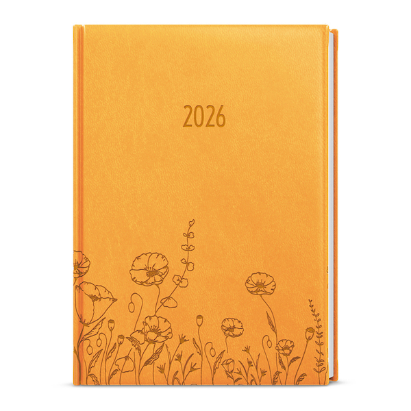 denní diář A5 vyrobený z měkkého hladkého materiálu v okrové barvě s motivem květin • díky formátu a velkému prostoru si můžete efektivně plánovat každý den • kalendárium: časové rozmezí 6:00 - 21:30, měsíční fáze, roční období, letní a zimní čas, znamení zvěrokruhu, odpočet dnů, měsíční tabulkový přehled, dny a měsíce v jazycích - CS, SK, EN, DE, mezinárodní svátky: CZ, SK, A, D, PL, H, GB, E, F, I, UA, místo na poznámky • informační stránky: osobní údaje, přehledný kalendář aktuálního roku a následujícího roku, měsíční plánování aktuálního roku, plán dovolených aktuálního roku, přehled státních svátků a významných dnů CZ/SK, jmenný seznam CZ/SK, daňový kalendář CZ/SK aktuálního roku, mezinárodní svátky, důležitá telefonní čísla, roční plánovací kalendář CZ/SK aktuálního roku, místo pro poznámky, mapa CZ/SK, zadní předsádka - kapsa • rozměr: 143x205 mm • vhodná technika potisku: ražba, ražba přes pásku, sítotisk • BDD61-23-26
