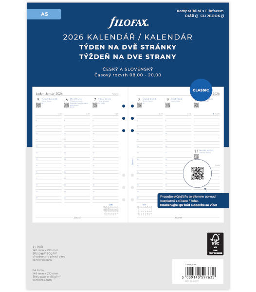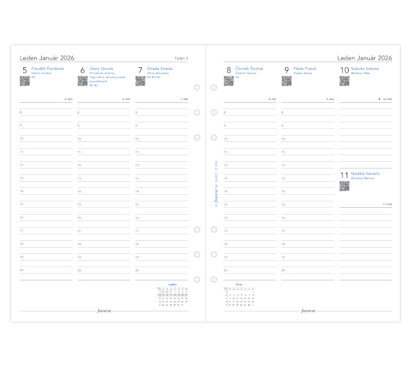 Náplň A5 pro diáře Filofax. Kalendář v bílé barvě, týden na 2 strany (ve sloupcích), linky, jmeniny, ČJ+SJ.