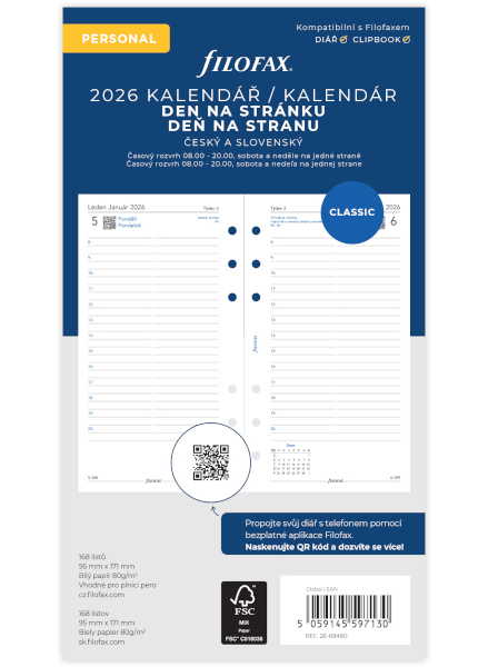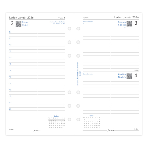 Kalendář v českém a slovenském jazyce s rozložením den na jednu stranu, linkovaný s vyznačeným časovým rozvrhem.