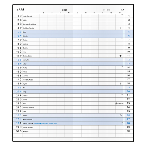 jednoduchý a praktický měsíční diář vyrobený z jemného hladkého materiálu s polomatným povrchem modré barvy • ideální pro každého, kdo si oblíbil měkkou šitou vazbu • kalendárium: časové rozmezí 8:00 - 17:00, měsíční fáze, roční období, letní a zimní čas, počet dnů • informační stránky: osobní záznamy, tabulkový kalendář následujícího a aktuálního roku, roční plánovací kalendář aktuálního roku, přehled státních a ostatních svátků ČR, místo na poznámky • rozměr: 79x179 mm • vhodná technika potisku: sítotisk, ražba přes pásku • BMX1-1-26