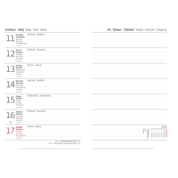 Formáty A5 navíc přehledný kalendář, mezinárodní tel. předvolby, mapa CZ, SK, EU.