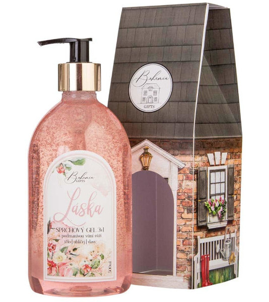 Luxusní sprchový gel 3v1 s extrakty šípku a růže 500 ml je vhodný na tělo, vlasy i ruce. Stylový obal ve tvaru domečku s nápisem LÁSKA.