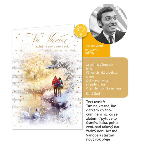 Po otevření zahraje píseň "Karel Gott: Bílé Vánoce" a rozsvítí se kuličky.