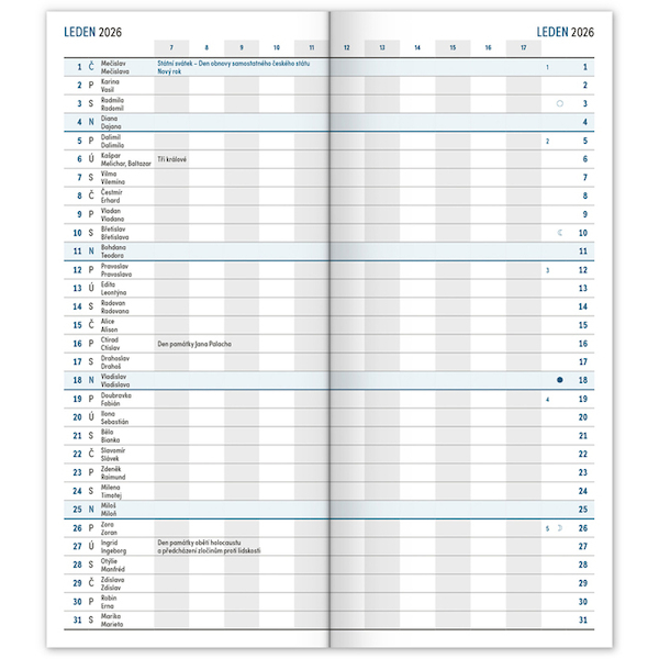 Obsahuje české kalendárium se jmény, svátky a památnými dny, pracovní kalendář, seznam jmen a přehled na rok 2026 a 2027.