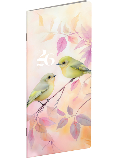 praktický tenký diář s motivem ptáků s měsíčním rozložením se vejde opravdu všude • obsahuje české kalendárium se jmény, svátky a památnými dny, pracovní kalendář, seznam jmen a přehled na rok 2026 a 2027 • rozměr: 8 x 18 cm • PGD-MESPL-35781
