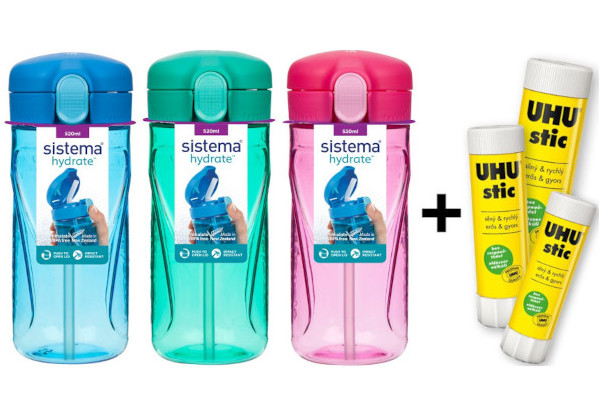 Láhev Quick Flip Top s brčkem 520 ml Sistema® Hydrate™ mix + balení lepidel UHU STIC