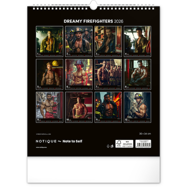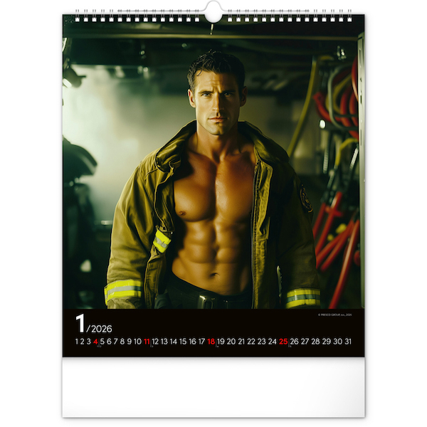 Dvanáct měsíců, dvanáct charismatických hasičů, kteří rozpálí nejednu stěnu! Užijte si pohled na vypracovaná těla v kalendáři plném žáru a stylu. Nechybí jednoduché kalendárium se zvýrazněnými nedělemi na černém pozadí.
