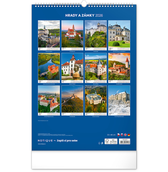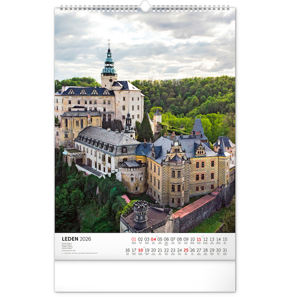 barevné fotografie Lokte, Lednice, Hluboké či Bouzova na stránkách nástěnného kalendáře ve výškovém formátu • jednoduché kalendárium s českými svátky a jmény • rozměr: 33 x 46 cm • PGN-35727-L