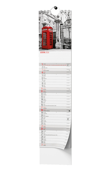 netradiční nástěnný kalendář ve formátu kravaty s působivými obrázky • kovová spirála "twin wire", háček pro zavěšení, obálka je tištěna na křídový papír s gramáží 150 g/m2, spodní karton je z kvalitní bílé lepenky v gramáži 450 g/m2 • kalendárium: měsíční fáze, roční období, letní a zimní čas, obrázek • informační stránky: tabulkový kalendář aktuálního a následujícího roku, místo na poznámky • rozměr: 85x420 mm • vhodná technika potisku: sítotisk, UV tisk • BNB1-26