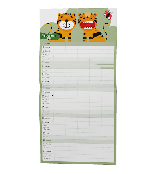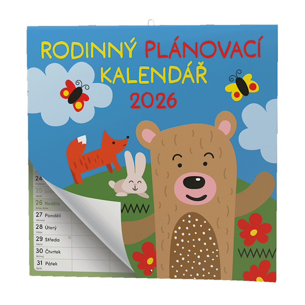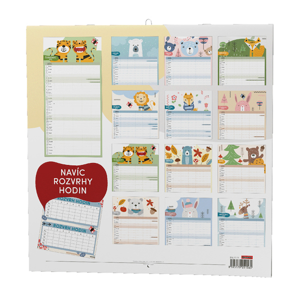 přehledný nástěnný kalendář pro to správné rodinné plánování • Vazba V1 na 2 skoby + háček, obálka je tištěna na křídový papír s gramáží 150 g/m2, uvnitř kartonová vložka pro zpevnění • kalendárium: poznámkové kalendárium se státními svátky, měsíční fáze, roční období, letní a zimní čas, místo na poznámky pro členy rodiny • informační stránky: tabulkový kalendář aktuálního a následujícího roku, místo na poznámky, rozvrh hodin • rozměr: 285x285 ( 285x570 rozloženo) mm • BNL10-26