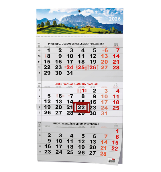 praktický nástěnný kalendář s tříměsíčním kalendáriem s barevnou laší s motivem přírody a s posuvným jezdcem vhodný do vaší kanceláře • Spodní a horní karton z lepenky, šitá vazba V1, laminovaný posuvný jezdec, horní karton s motivem přírody • kalendárium: dny a měsíce v jazycích - CS, SK, EN, DE mezinárodní svátky: CZ, SK, A, D, PL, H, GB, E, F, I, UA • rozměr: 292x420 mm • vhodná technika potisku: sítotisk, UV tisk • BNC7-26