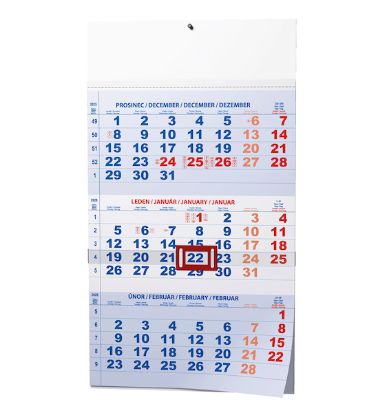 praktický nástěnný kalendář s tříměsíčním kalendáriem a posuvným jezdcem vhodný do vaší kanceláře • kalendárium: dny a měsíce v 5 jazycích - CS, SK, EN, DE, RU, mezinárodní svátky: CZ, SK, A, D, PL, H, GB, E, F, I, UA, RUS • vhodná technika potisku: sítotisk, UV tisk • rozměr (mm): 292x420 • BNC1-26