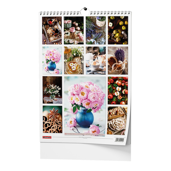 výjimečný nástěnný kalendář s voňavými stránkami • každá strana má jinou vůni a dotvoří tak celý obraz jednotlivých stran kalendáře • kovová spirála "twin wire" po celé šířce kalendáře s háčkem pro zavěšení, obálka je tištěna na křídový papír s gramáží 150 g/m2, spodní karton je z kvalitní bílé lepenky v gramáži 600 g/m2 • informační stránky: každý vnitřní list voní • rozměr: 320x450 mm • vhodná technika potisku: sítotisk, UV tisk • BNV5-26