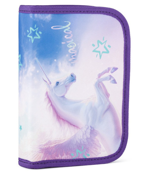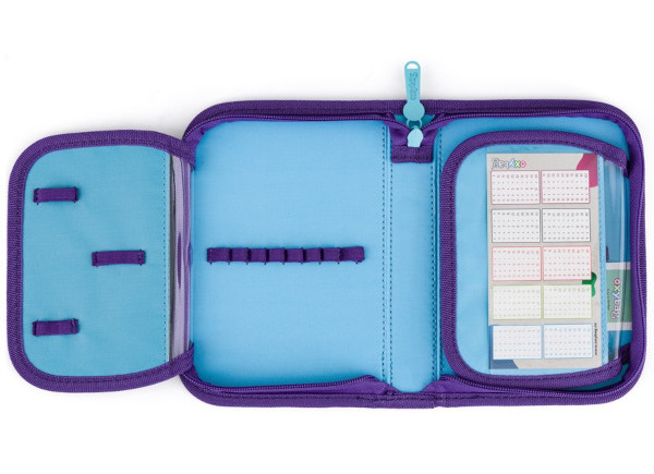 Jednopatrový školní penál s 2 chlopněmi, prázdný obsahuje 25 gumových poutek pro uchycení psacích potřeb.