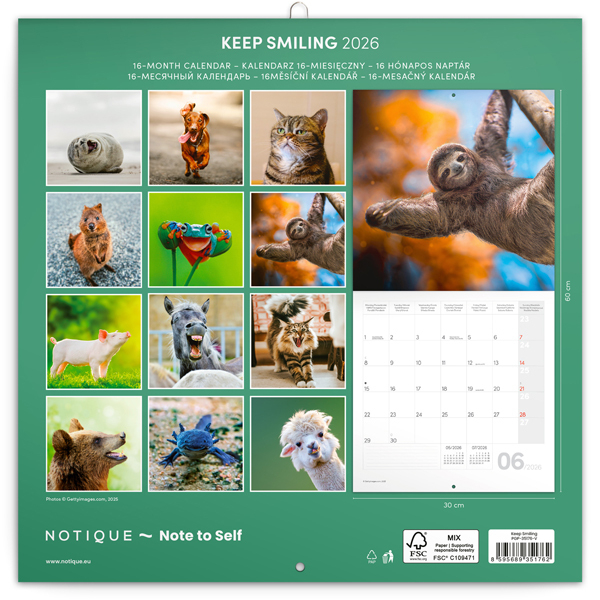 V kalendáři kromě fotek najdete přehledné kalendárium od září 2025 do prosince 2026 v šesti jazycích, měsíční fáze, důležité svátky a prostor pro poznámky na každý den.Šířka: 30 cm
