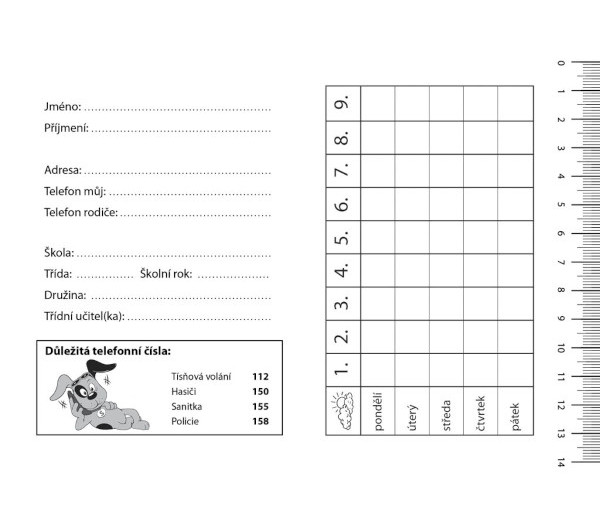 Školní deníček – úkolníček ve formátu A6 s rozvrhem hodin.