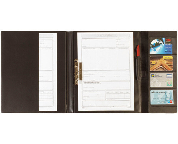 Kapsy na založení dokumentů, rychlosvorka, kapsy na vizitky a platební karty.