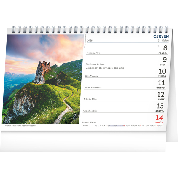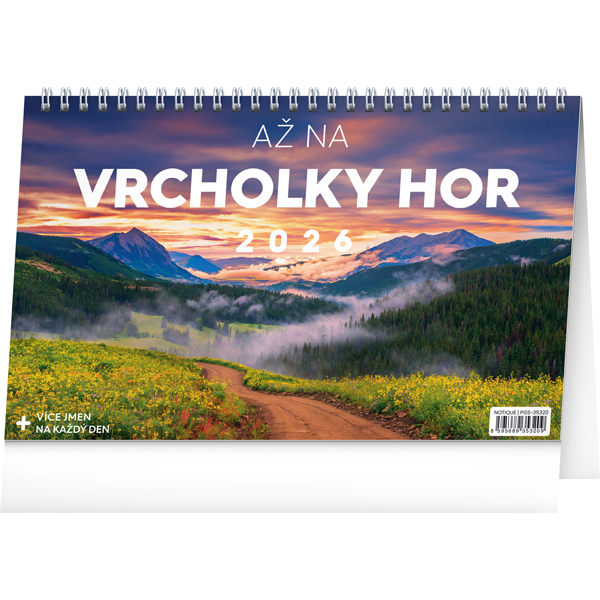 stolní kalendář s fotografiemi hor a pohoří z celého světa • prohlédněte si zblízka hory od Washingtonu v USA přes evropu až po čínu • barevné fotografie doplňuje české týdenní kalendárium se jmény, svátky a památnými dny, fázemi měsíce, rozšířený seznam jmen a přehled na rok 2026 a 2027 • rozměr: 23,1 x 14,5 cm • PGS-35320