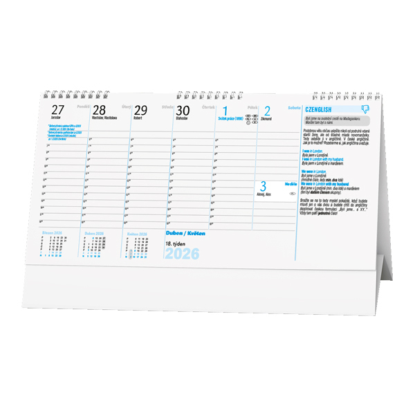 daňový kalendář s týdenním kalendáriem a prostorem pro plánování • díky anglickým frázím si můžete zopakovat své jazykové znalosti • české týdenní jmenné kalendárium • státní svátky, ostatní svátky a významné dny, měsíční fáze, roční období, letní a zimní čas, mezinárodní svátky, daňové termíny, tabulkový přehled 3 měsíců, místo na poznámky, česko-anglické fráze a slovíčka pod záštitou Help for English • vhodná technika potisku: sítotisk, UV tisk • rozměr (mm): 300x150 • BSN5-26