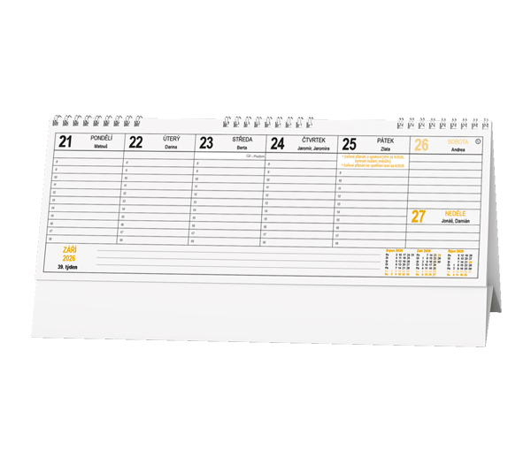 oblíbený daňový kalendář s týdenním kalendáriem pro plánování vašich daní • krásná barva a prostor pro poznámky z něho dělá skvělého pomocníka • české týdenní jmenné kalendárium • státní svátky, ostatní svátky a významné dny, měsíční fáze, roční období, letní a zimní čas, tabulkový přehled 3 měsíců, daňové termíny, místo na poznámky • vhodná technika potisku: sítotisk, UV tisk • rozměr (mm): 285x104 • BSC10-26