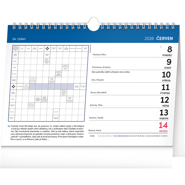 stolní kalendář s křížovkami na každý týden • díky háčku ho můžete zavěsit na stěnu či ponechat na stole • obsahuje české kalendárium se jmény, svátky a památnými dny, měsíční přehled a dostatek prostoru na poznámky • rozměr: 30 x 21 cm • PGS-35700