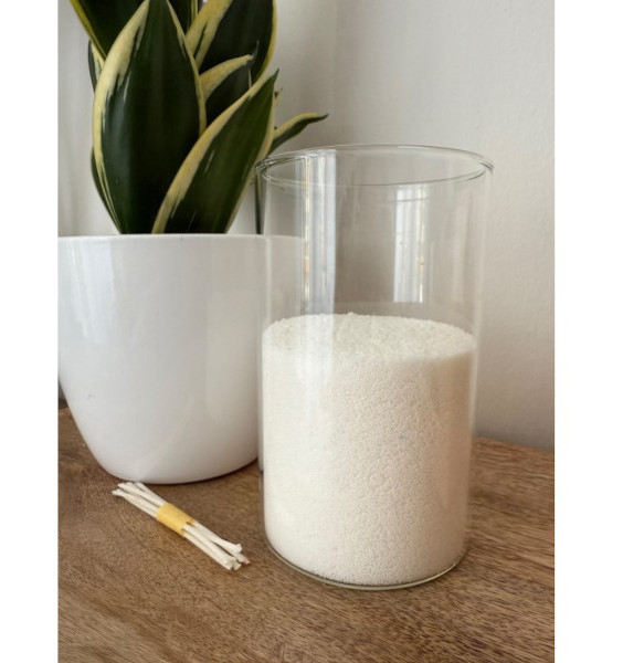 Sada zahrnuje 500 g sypaného vosku v pestrých barvách, několik knotů a elegantní skleněnou nádobu.