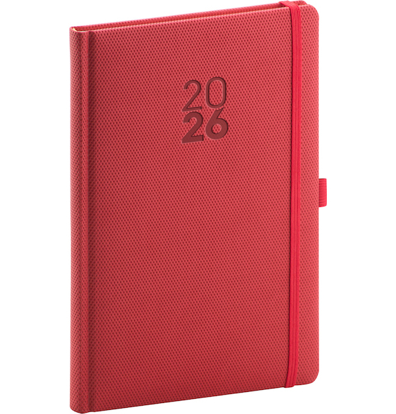 týdenní diář Diamante 2026 v červené barvě • povrch diáře má jemnou strukturu připomínající výbrus diamantu a je ideální pro všechny typy ražeb • diář má zakulacené rohy, poutko na tužku a elastickou gumičku • týdenní rozvrh s česko-slovenským kalendáriem a doplňkovou angličtinou, němčinou, maďarštinou a ruštinou • kalendárium od prosince 2025 • měsíční plánovací kalendář 2026 • měsíční plánovací kalendář 2027 • roční plánovací kalendář 2026–2027 • pracovní plánovací kalendář • svátky České a Slovenské republiky a mezinárodní svátky • rozšířený seznam českých jmen • mapa České a Slovenské republiky • místo pro osobní údaje • textilní záložka • perforované růžky • prostor pro poznámky • rozměr: 15 x 21 cm • PGD-TA5DI-6072