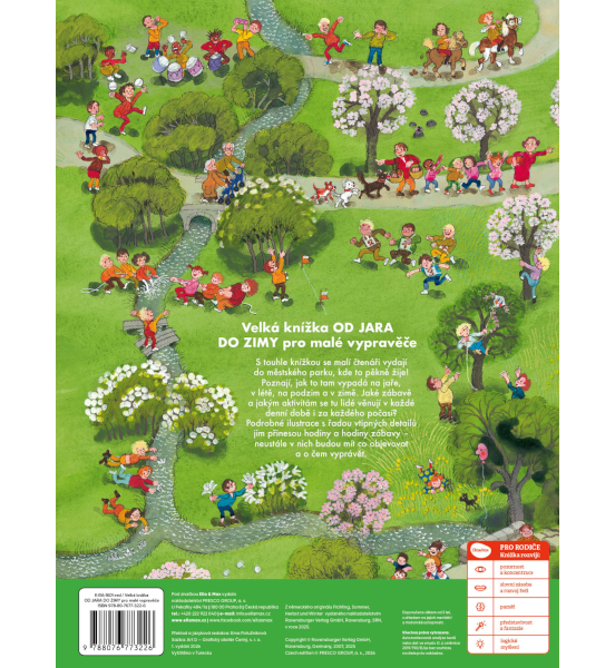 S touhle krásnou barevnou knížkou se malí čtenáři vydají do městského parku, kde to pořádně žije! Poznají, jak to tam vypadá na jaře, v létě, na podzim a v zimě. Jaké zábavě a jakým aktivitám se tu lidé věnují v každé denní době i za každého počasí? Podrobné ilustrace s řadou vtipných detailů jim přinesou hodiny a hodiny zábavy – neustále v nich budou mít co objevovat a o čem vyprávět. Díky tomu rozvíjejí děti nejen svou představivost a fantazii, ale také slovní zásobu a základy předčtenářských dovedností.