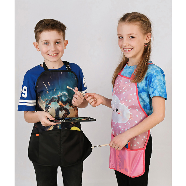 Zástěrka na výtvarnou výchovu se navléká nastavitelným popruhem přes hlavu a zaváže se kolem těla pomocí šňůrek.
